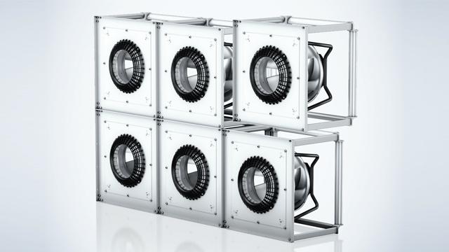 另一個優(yōu)點是氣流通過上風口,尤其是下風口的部件,例如過濾器和熱交換器時更加均勻。從而提高空氣過濾效率及傳熱性能。與單個大型離心風機相比,多臺小風機不僅重量輕而且安裝空間緊湊。這大大降低了系統成本并且易于更換風機。
